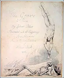 Blair published only three poems. One was a commemoration of his father-in-law and another was a translation. His reputation rests entirely on his third work, The Grave (1743), which is a poem written in blank verse on the subject of death and the graveyard. It is much less conventional than its gloomy title might lead one to expect. Its religious subject no doubt contributed to its great popularity, especially in Scotland, where it gave rise to the so-called "graveyard school" of poetry.[1] The poem extends to 767 lines of various merit, in some passages rising to great sublimity, and in others sinking to commonplace.