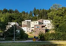 The college's fully residential campus is located on the newly refurbished Freiburg Charterhouse, a former Carthusian monastery dating to the 14th century.[2] The students are housed in newly built and cube-shaped student houses, which were designed by architect Peter Kulka and follow Freiburg's energy-efficient standards. The houses are sustainable and are powered by energy from solar panels. The student village consists of eight houses for students and four houses for teachers. The student houses house around 24 people. All houses are equipped with kitchens with common supplies, living room with tables, 4 bathrooms and a storage room.