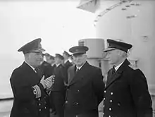 Burnett, left, with First Lord of the Admiralty A. V. Alexander and Admiral Sir John Tovey, C.-in-C. Home Fleet, on board HMS Belfast in January 1943