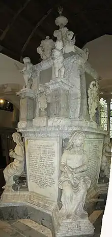 Furnese died on 7 March 1733 at Waldershare, Kent, and was succeeded by his son Henry.[1] According to a contemporary, he died "by his own fault, for he had one of those colds hanging on him and he drank so hard that he was not sober for ten days before he was taken ill".[6] He was buried at Waldershare on 14 March.[1] His widow survived him by 46 years, dying in Dover Street, London, on 25 February 1779 aged 70.[1] She was buried in Grosvenor Chapel, Westminster.[1]