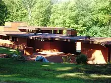 The Robert H. Sunday House is located in Marshalltown, Iowa, United States. It was designed by Frank Lloyd Wright in the Usonian style, and was listed on the National Register of Historic Places in 1988. Initially the Sunday's choose the Usonian Automatic, a natural concrete block model, for their home. When it provided unworkable, Wright sent the plans for this house. In style and materials it is very similar to the 1953 Usonian Exhibition House.[2] It was the sixth of seven houses designed by Wright and built in this style in Iowa. Sunday, who owned Marshall Lumber in Marshalltown, acted as his own general contractor. In fact, he and his wife did much of the work themselves. It is also believed to be last of this style built in brick.[2] John H. "Jack" Howe, a Wright assistant who supervised the initial construction, designed an addition to this house in 1970 that conforms seamlessly with the original. It includes the family room, family room terrace, and the dining room. The original house followed an L-shaped plan, and with the addition it is now a T-shaped plan. Howe had previously designed (1964) the building for Sunday's business.