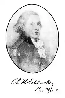 It is thought that Colebrooke was born in Switzerland. His father Robert Colebrooke (1718 - 1784) was the British ambassador to the Swiss confederacy from 1762 to 1764 and his mother was Mary (née Williams). The father had to sell his property of Chilham Castle in 1774 to pay his creditors. Colebrooke joined the Bengal Infantry in 1778. T.D. Pearse trained and appointed him as Surveyor in 1783. Colebrooke surveyed the distance from Hooghly to Madras using a perambulator. Trained in topographical illustration and surveying he produced "Twelve views of places in the kingdom of Mysore" in 1794 based on his work in Mysore in 1790. He accompanied Archibald Blair to survey the Andaman Islands in 1789. Colebrooke Island and Passage were named after him. Colebrooke compiled a vocabulary of Andaman islanders in an article to the Asiatic Society of Bengal. He also described the volcanic Barren Island.[2][3] After Alexander Kyd was moved to the Andamans as Superintendent of the settlement, the position of Surveyor General of Bengal became vacant and Colebrooke was appointed in 1794. He remained in this position he kept until his death from dysentery in 1808 on the way from Rohillakhand to Calcutta at Bhagalpur. Colebrooke was a cousin of the orientalist H.T. Colebrooke. He was promoted to Lieutenant in November 1778, Lt-Colonel in November 1803.[4] Colebrooke took a special interest in the changing course of the Ganges river. One of Colebrooke's suggestions, made in 1795, was that by cutting a 20 foot wide and 15–20 foot deep canal between the Hurdum and Ichamati[5] to connect the Churni River and the Ganges would make the river navigable for 155 miles and avoid the route through the Sunderbans.[6] The idea was opposed by James Rennell who said:[7]