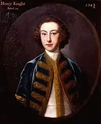 - Henrietta Knight (1729–1763). His only daughter Henrietta, who also predeceased him, married firstly Charles Wymondsold, son of Matthew Wymondsold of East Lockinge and Putney, a speculator in the South Sea Company. Having run away from him, and been divorced in 1754, Henrietta married secondly the Hon. Josiah Child (d. 1760), an officer in the Royal Navy, the younger son of Richard Child, 1st Earl Tylney, of Wanstead House, Essex, son of the very wealthy Sir Josiah Child, governor of the East India Company.[15] She gave birth to their son, Josiah, shortly before her divorce came through. The younger Josiah was brought up by Lord Tylney, but died in Florence in 1774. Mrs Child then had an affair with Louis-Alexandre de Grimoard de Beauvoir, Comte de Roure and died giving birth to their son.[16]