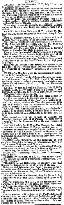 - The New York Times, Died, [death notice] July 25, 1878. (PDF)
