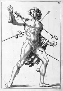 An engraving by White showing injuries that can be caused by different weapons, from John Browne's A Compleat Discourse of Wounds (1678)[1]
