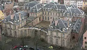 Born in Paris, Robert de Cotte began his career as a contractor for masonry, working on important royal projects between 1682 and 1685, when he was made a member of the Académie royale d'architecture and architect of the Court, ranking third in importance after Mansart's seldom-credited assistant François Dorbay.[3] On his return to France after a six-month sojourn in Italy (1689–1690), in the company of Jacques Gabriel,[4] he became the director of the Manufacture des Gobelins, where not only the famous tapestries, but also royal furnishings were produced; even designs made under his direction for wrought iron balustrading are to be found among the eight volumes of drawings for the Gobelins, and for other public and private commissions, conserved at the Cabinet des Estampes, Bibliothèque Nationale.[5] In 1699, when Mansart was made Surintendant des Bâtiments, a position otherwise invariably reserved for a noble layman, de Cotte became his second-in-command in an executive function, charged with overseeing all the files of drawings, the stocks of marble and other materials including those for the royal manufactures of the Gobelins and Savonnerie, with overseeing the bidding process with contractors and with liaison with the Académie, of which he was made a member that same year. Fiske Kimball, the chronicler of the Rococo, notes that there are no surviving drawings by de Cotte from this period, nor from the period after Mansart's death in May 1708.[6]