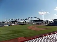 The five arches of the bridge are a symbol often used to represent the Quad Cities. The two largest arches symbolize Rock Island and Davenport while the smaller ones represent the other surrounding Quad-Cities (Bettendorf, Moline, and East Moline). Modern Woodmen Park in Davenport is just upriver from the bridge. On the Rock Island side, "The District," the nightlife hub of the Quad Cities, is about one block east of the bridge.