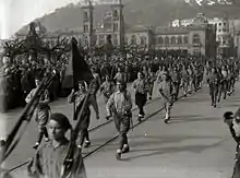 Prior to 1931 elections Oyarzun lamented Quema de conventos[80] and advocated an alliance of Catholic, monarchist, patriotic and regionalist forces.[81] Entrusted by Don Jaime with launching a Carlist daily, he failed due to financial issues[82] but launched an own Pamplona-based review, Tradición.[83] In the 1936 elections he ran as a Carlist candidate on a joint Candidatura Contrarrevolucionaria ticket in Madrid[84] and failed.[85] The July 1936 coup caught Oyarzun on a diplomatic mission in Vienna. Asked to sign a declaration of loyalty he refused, in his August 2 statement noting that such an act would violate his conscience, especially given the government was dominated "por elementos revolucionarios, comunistas y socialistas revolucionarios".[86] He then travelled to the Nationalist zone offering the Burgos junta his services,[87] only to find that in late September he would have to visit Vienna again: together with a group of top Carlist politicians he attended the funeral of his king Don Alfonso Carlos and in October he visited the new regent Don Javier in his Puchheim residence.[88]