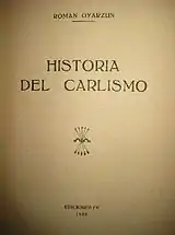 Already during the Republic days Oyarzun's translation was received rather well.[123] Later monographs on Cabrera and Villareal were acclaimed[124] and the former rewarded.[125] Historia del Carlismo was welcome by scholars[126] and the public alike as certified by numerous re-editions, especially that the narrative ended conveniently in 1936 and did not pose a challenge to the official Francoist propaganda. Until the 1990s it remained the key concise volume on Carlist history, with an alternative offered only by massive and detailed series of Melchor Ferrer, appearing between the early 1940s and the late 1970s.[127] As a primary source of scholarly reference Oyarzun's synthesis was replaced as late as in the late 20th century, by the 1990-1992 works of Clemente[128] and especially by the 2000 work of Canal.[129] Until today it remains a must-have bibliographic entry of every work dealing with the Carlist history until the Civil War; a 2008 PhD dissertation declared it "the main reference work"[130] and indeed another one of 2012 referred it 45 times.[131] Until recently, it was counted among " clásicas obras",[132] acknowledged as "una obra a un tiempo de corte clásico y moderno",[133] "obra clásica sobre la historia del carlismo",[134] "sintesis ya clásica"[135]