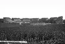 The semicircular shape of the grandstands cavea is incorporated into the gradient of San Albin hill. In its time it had a seating capacity of 6,000. The diameter is about 86 meters (282 feet). The stands are divided into three areas: the innermost ima cavea, (22 rows) media cavea (5 rows) and summa cavea, the latter being severely deteriorated today. The first rows ima cavea, where the wealthier social classes were seated, is divided into five radial sectors cunei, delimited stairs, a horizontal level, and a corridor praecinctio that separates it from the upper bleachers. Six doors at the top give access to a corridor covered by a semicircular dome ring that serve as entry and exit doors at the two extremities. The middle and upper caveas have five rows of seats each and are supported by a complex system of arches and barrel vaults. In total, thirteen outside doors facilitate access and entrance to the theatre.