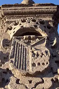 Coat of arms of Salamanca, sculpted on a column at the entrance of the Roman bridge.