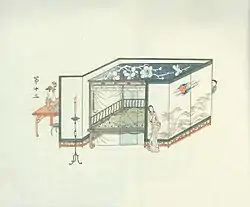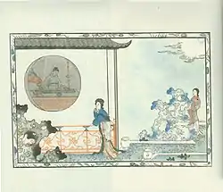 In the late Ming and early Qing dynasties, art that illustrated novels and dramatic productions became increasingly popular, and illustrations of The Romance of the Western Chamber were the most popular of all. Various Ming painters designed illustrations of the story, including Qian Gu, Tang Yin, and Chen Hongshou. One of the most accomplished renditions of the tale is the series of woodblock prints published, and probably designed, by Min Qiji (1580–after 1661) of Wucheng, Zhejiang province. His work, which dates to 1640, includes a frontispiece depicting Cui Yingying as well as one image for each of the twenty acts of the Yuan dynasty drama by Wang Shifu. Min Qiji's album may also be one of the first to rely on the Chinese taoban 套板 printing technique, using six colors to fill in contours but also to add modeling and shading to the depicted images. A significant innovation of Min Qiji's album is the presentation of scenes as if they were representations of dramatic performances or already-existing pictorial illustrations: the characters of the story appear as if they were paintings on handscrolls, folding fans, or standing screens; inscriptions on a bronze vessel; decorations on a lantern; and puppets used in a theatrical performance. It is possible that the innovative compositions of this album derive from designs by the Yuan artist Sheng Mao, also known as Sheng Mou (1271–1368).[9] The album was likely meant to appeal to a wealthy customer who was a fan of the story.[10]