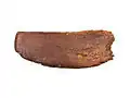 A short, curved, unfluted tablet, 24 × 9 × 1.8 cm, pitted and with one end broken off, made of unknown wood. There is a hole in the middle of the straight edge, probably for hanging. Short segments of the four middle lines have been obliterated on the right side of side b.