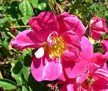 'William Baffin' is a tall Hybrid Kordesii shrub rose variety, 7 to 10 ft (2.1–3.0 m) in height, with a 3 to 4 ft (0.91–1.22 m) spread.[2] It has semi-double (8–15 petals), medium-sized 2.5 in (64 mm) flowers and a flat, saucer-shaped bloom form. Blooms are deep pink with golden stamens and flashes of white at the center of the petal. Flowers are carried in clusters of 10–30 and have either no fragrance or a light fragrance.[1] The plant has an arching, climbing growth habit and small, glossy, dark green foliage. It is very disease resistant and blooms continuously throughout the season.[3]