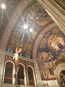 The main altar is carved from black Marquina Florido marble, imported from Spain, and, before the renovation, was covered with an oak baldachin supported by marble columns. The pulpit is carved from white oak by German artisan August Schmidt. Around the apse are statues of the eight authors of the New Testament. Each statue stands under a carved flèche.[2][3]