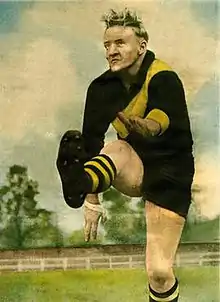 Wright cut a noticeable figure, with his huge frame (188 cm and over 100 kg) and golden blond hair.[3] In the post-war era, all VFL clubs were valiantly scouring the country, looking for big men capable of dominating the rucks and giving their team first use of the ball at ball-ups and boundary throw-ins. The boundary throw-in disappeared from the game after a 1925 rule change, but the rule reverted to its original form during the war, therefore increasing the emphasis on ruck play.[4] The Tigers could see Wright's rare ability but, due to his truncated early career, felt he still needed to learn the subtleties of the game. Besides, in Jack Dyer and Bill Morris, Richmond already possessed the best ruck combination in the competition.