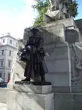 Jagger at that time was preoccupied with the Anglo-Belgian Memorial in Brussels and did not begin work on the Royal Artillery memorial until October, at which point he made several changes to the proposed design, which he submitted to the RAWCF early the following year.[26] The revised memorial would be a third larger than before, cruciform in plan, and guarded by three bronze soldiers. Jagger rotated the howitzer by 90 degrees, bringing it into line with the main axis of the base, pointing towards the Wellington Arch. After much discussion—including advice from Lutyens and Sir Reginald Blomfield representing the Royal Fine Arts Commission—Jagger agreed that the howitzer would point south to produce a pleasing silhouette from the park. The change also resolved an objection raised by the King about the "gloomy" figure on the front of the memorial staring down Constitution Hill towards Buckingham Palace.[21] A year-long debate occurred within the RAWCF as to what inscription should be placed on the memorial, adding to the delay.[28][29] Jagger made another change in early 1924, adding an effigy of a dead soldier to the fourth side of the memorial, in keeping with the soldiers on the other three sides. The proposal proved controversial. Although recumbent effigies were not uncommon on tombs and (to a lesser extent) war memorials, a sculpture of a dead soldier at eye level was an unusual and dramatic feature among First World War memorials—architects often preferred abstract, classical designs (such as the Cenotaph) or portrayed death through allegory. Jagger was adamant about the inclusion, even offering to pay for the casting of the additional figure himself.[21][30] After considerable debate, the RAWCF agreed to the modification.[28][31] Jagger's work continued to take longer than planned, partially due to shortages of staff, the need to approve each amendment to the plan, and practical problems on the site itself.[32] The names of his models for three of the statues are known—William Fosten for the driver, another ex-gunner called Metcalfe for the ammunition carrier, and Lieutenant Eugene Paul Bennett, VC, who fought in the same regiment as Jagger, for the commander.[30][33][34]