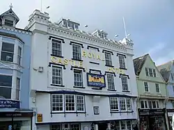 The hotel is a grade II* listed building,[6] of the early Georgian style but with a Victorian facade, four stories with an attic, painted white, built as two separate merchant houses.[7] It has 24 rooms, with a "glassed-in courtyard", a winding wooden staircase, 46 antique spring bells, the original coaching horn and numerous antiques.[8] The main restaurant is located on the first floor, with 2 bars at ground level - the Galleon bar and the Harbour bar.[9] Nine rooms have a jacuzzi bath and five rooms contain a four-poster bed.[8] Reputedly the timber beams downstairs were salvaged from the wreck of the Spanish Armada.[3] An 1895 advertisement by Robert Cranford said "Patronised by Royalty. Fitted with Electric Light and Bells.... and sanitary arrangements are perfect."[7] Other notable features in the hotel are old leather-bound books in the library, woodwork from a "Spanish man-o-war in the Galleon bar", antique chaises longues, huge carved chairs, and velvet curtains.[4]