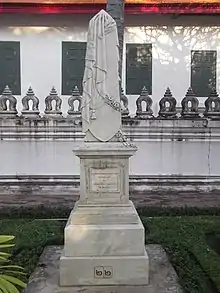 This monument is shaped like a prang mounted on a four-sided pedestal of grey and white marble.