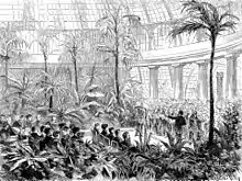 The first construction phase took place between 1874 and 1893, ending with the completion of the so-called Iron Church, a domed greenhouse, which would originally serve as the royal chapel. The inauguration took place in 1880, but the complex was also expanded afterwards.[4] During that period, the king was preparing his Congo Free State, a private colony which was founded in 1885. The greenhouses were intended as a symbol of the king's colonial power: plants from Central Africa were said to illustrate that power. In particular, the Congo Greenhouse and the Embarcadère Greenhouse were built in 1886–1888 from this perspective. A third zone was constructed from 1892 to 1905. For this, following Balat's death in 1895, Leopold called upon the architects Henri Maquet and Charles Girault. The octagonal Palm Pavilion was furnished as a bedroom and connected to the palace by a subterranean corridor where Leopold received his mistresses.[5] After the king's death in 1909, the greenhouses were preserved, but the Iron Church was converted into a private royal bathing house.