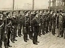 ![]() An 1873 engraving showing men of the Royal Naval Artillery Volunteers being inspected by the Second Sea Lord, Rear Admiral John Tarleton aboard HMS President. | |
