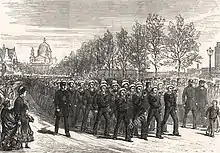 The RNAV trained using the Royal Navy artillery, rifle, pistol and cutlass drills.[3] All men were required to attend two drills each month until they were passed as "efficient". Men rated efficient wore a silver lace chevron on their right sleeve; those that rated efficient five times wore a star above the chevron and those rated ten times wore two stars. In addition, men who passed the Royal Navy's "trained man" standard wore two chevrons.[4] In 1891 the unit numbered some 66 officers and 1,849 ratings. The previous year some 633 recruits were admitted, showing the unit had a high turnover of members.[1]