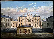 The Royal Victoria Hospital has its origins in a number of successive institutions, beginning in 1797 with The Belfast Fever Hospital and General Dispensary, located in Factory Row (although the dispensary originally opened in 1792). This moved to West Street in 1799, and then to Frederick Street in 1817.[2] In 1847 the hospital separated from the General Dispensary and became the Belfast General Hospital. In 1875 it gained the royal charter,[3] becoming the Belfast Royal Hospital, and in 1899 it was renamed the Royal Victoria Hospital. In 1903 it moved from Frederick Street to its present (Grosvenor Road) site.[4]