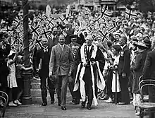 The Prince of Wales at Rotorua on his 1920 visit to New Zealand. On the left is Sir Joseph Ward, and on the right is Māui Pōmare. - 1927: Duke and Duchess of York[1]