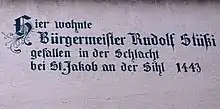 He died at the Battle of St. Jakob an der Sihl, defending the bridge over the Sihl while covering the retreat of the army of Zürich. According to chroniclers, he was killed by a confederate hiding below the bridge. Another version of the story has Stüssi stopping in the middle of the bridge, brandishing his broad battle-axe and shouting, "Halt, citizens, halt!" To this a man of Zurich cried, "May God's lightning blast thee! All this evil comes from thee alone," and ran him through with his lance.[1]