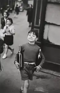 The picture is one of the best known of the artist and is named from the street where the event was caught on camera. It was taken candidly in the Rue Mouffetard, in Paris, and it exemplifies what he described as the decisive moment. The picture is also one of the best examples of the genre of street photography, which was cultivated by the author.[1] The atmosphere of the photograph is very light-hearted. It depicts a young smiling child, named Michel Gabriel, carrying two bottles of wine. Behind him, at the left, the blurred image shows two girls that watch him amused. Two adult women, also blurred, are seen at the bottom left, of those only one is looking at the scene.[2][3]