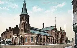 The foundation stone for the new building was laid by the Earl of Lichfield on 26 June 1878.[5] It was designed by William Tadman-Foulkes in the Gothic Revival style, built in red brick with stone dressings and was completed in 1879.[1] The design involved an asymmetrical main frontage with three bays facing onto the Market Square; the central bay featured a clock tower with an arched doorway on the ground floor and a tall section with louvres and clock faces all surmounted by a spire; on the right, the building curved round into Anson Street to form a single-storey section which was fenestrated by arched windows and surmounted by a parapet. Beyond that there was a two-storey-section which was fenestrated by arched windows and featured gabled end-bays, and, at the north end, there was a section which was formed by the reconstruction of the mid-19th century extension to the original town hall.[1] Internally, the principal rooms were the market hall on the ground floor and the assembly rooms and municipal offices on the first floor.[1]