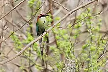 Territory is very valuable to russet-crowned motmots because of the lack of suitable nesting areas.[6][7][11] As a result, Russet-crowned motmots they are very territorial.[6][7][11] However, Richard E. Tashian reported seeing russet-crowned motmots in flocks of birds including golden-fronted woodpeckers, white-throated Magpie-jay, coloured thrush, streak-backed oriole and coppery-tailed trogon in Guatemala.[14] This suggests that russet-crowned motmots defend their territories only against individuals of their species which is called infraspecific territoriality.[15] When there is an intruder, the russet-crowned motmot holds a leaf in its beak to display combative behaviour before chasing or fighting the intruder.[11] This territorial behaviour is performed year-round during the breeding and non-breeding season.[11] Both paired and unpaired males and females defend their territory.[11] Mating pairs will react differently towards male intruders and female intruders.[11] They are more aggressive towards a male intruder than a female intruder.[11] When a male intruder holds a leaf, the mating pair get closer to chase or fight him.[11] But when a female intruder holds a leaf, the mating pair holds a leaf as well to warn her.[11]