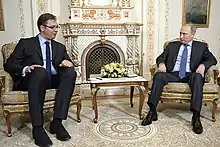 The visit to Russia by Serbia's president Aleksandar Vučić in December 2017 was hailed by Politika as a symbolic ending of ″decades of stagnation in relations″.[68] In November 2019 Serbian security services revealed activities of Russian intelligence operatives who were meeting and passing money to Serbian army officials.[69]