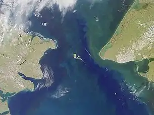 The Bering Strait, where Russia's east coast lies closest to Alaska's west coast. Early Russian colonization occurred well south of the strait, in the Aleutian Islands.