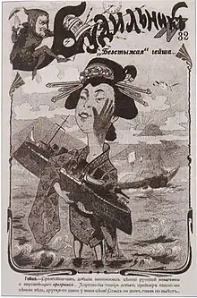 Illustration of a "shameless geisha" holding Reshitel‘nyi after Japan captured the destroyer in a neutral port, from the Russian magazine Budil'nik ("Alarm Clock"), No. 32, 1904.