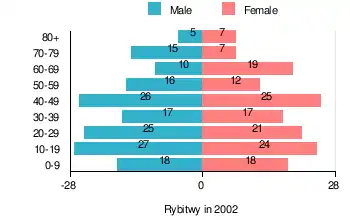 According to the 2002 Poland census, there were 310 people residing in Rybitwy village, of whom 51.6% were male and 48.4% were female. In the village, the population was spread out, with 24.5% under the age of 18, 37.7% from 18 to 44, 18.7% from 45 to 64, and 18.7% who were 65 years of age or older.[1]