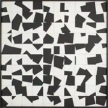 Winiarski experimented with chance and probability by composing abstract arrangements of small squares, initially in black-and-white and later in color.[3] Winiarski regarded the anonymous building blocks of a small square as "statistical material" from which to build the surface of the work.[4] In 1966, Winiarski wrote: "My ambition involves attempts at visually recording events and presenting their statistical distributions visually. The multitude of possibilities that such treatment of the image offers fascinates me".[2]:404–405 Between 1967 and 1977, Winiarski created set designs for several plays performed in Poland, including Medea by Euripides, William Shakespeare's Othello and Macbeth, among others.[1]