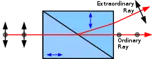 In the Sénarmont prism the s-polarized ray (i.e., the ray with polarization direction perpendicular to the plane in which all rays are contained, called the plane of incidence) passes through without being deflected, while the p-polarized ray (with polarization direction in the plane of incidence) is deflected (refracted) at the internal interface into a different direction. Both rays correspond to ordinary rays (o-rays) in the first component prism, since both polarization directions are perpendicular to the optical axis, which is the propagation direction. In the second component prism the s-polarized ray remains ordinary (o-ray, polarized perpendicular to the optical axis), while the p-polarized ray becomes extraordinary (e-ray), with a polarization component along the optical axis. As a consequence, the s-polarized ray is not deflected since the effective refractive index does not change across the interface. The p-polarized wave, on the other hand, is refracted because the effective refractive index changes upon changing from o-ray to e-ray.