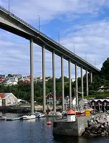 The Sørsund Bridge (Norwegian: Sørsundbrua) is a bridge that crosses the Sørsundet strait between the islands of Kirkelandet and Innlandet in the town of Kristiansund which is in Kristiansund Municipality, Møre og Romsdal county, Norway. The 408-metre-long (1,339 ft) bridge has 19 spans, with a main span of 100 metres (330 ft). The bridge opened in 1963 and it carries County Road 420.[1][2]