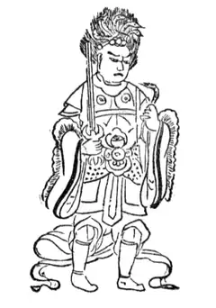 In East Asian art, he is often depicted with a reddish white complexion and assumes a posture of great authority. In his left hand he holds a snake or dragon and in his right hand he wields a sword. He wears a crown that consists of five snakes.