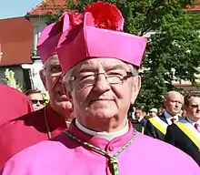 Pope John Paul II appointed him titular bishop of Bettonium and the Bishop of the newly re-created Military Ordinary of Poland on 21 January 1991. He received his episcopal consecration from Cardinal Józef Glemp on 23 February 1991 in the Jasna Góra Basilica in Częstochowa.[3] On 18 April 1991 he was appointed to the rank of General of the Brigade, and on 11 November 1993 to the rank of Divisional general.[4] During the office of the bishop, he reconstructed the diocesan structures of the Ordinariate, establishing a network of military parishes across Poland. He also established two new distinctions of the Ordinariate: in 1995 the diploma "Benemerenti" and in 2001 the medal "Milito pro Christo".