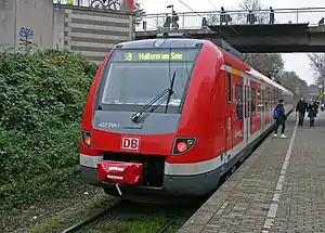 Line S 9 is an S-Bahn line on the Rhine-Ruhr network, operated by DB Regio. It runs from Recklinghausen Hbf / Haltern am See in the north through Gladbeck West - Essen Hbf to Hagen (Westphalia) Main Station in the south. During the day two services per hour run between Wuppertal and Gladbeck West, one service per hour between Gladbeck and Recklinghausen Hbf and Gladbeck and Haltern am See and one service per hour between Wuppertal and Hagen, using FLIRT 3XL electric multiple units.[2]