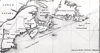 Arctic passed Cape Clear, at the southernmost point of Ireland, early on the morning of September 21, and entered the open Atlantic approaching her maximum speed of 13 knots (15 mph). In settled weather she progressed uneventfully, and early on September 27 had reached the Grand Banks, off the coast of Newfoundland.[26] This area is formed by a series of relatively shallow submarine plateaus forming part of the Canadian continental shelf.[27] Here, the sub-Arctic waters of the Labrador Current meet the warm northbound waters of the Gulf Stream to create weather systems typified by intermittent mists and fog.[28][29] It was the practice for steamers to maintain maximum speeds in these conditions, although before electronic aids to navigation the risk of collision was considerable. Keeping schedules was considered paramount, particularly in the Collins Line where, Alexander Brown states in his 1962 account, "there was no room for overcautious shipmasters".[30] On the morning of September 27, Luce observed typical Grand Banks conditions: "at intervals of a few minutes a very dense fog, followed by being sufficiently clear to see one or two miles."[31]