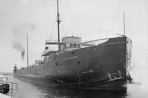 On August 13, 1896, the Cleveland based newspaper, The Marine Record, reported that she would probably be delivered to her owners on August 25, 1896.[29] Inland Lloyd's valued her at $240,000 (equivalent to $7.3 million in 2022[30]) and gave her an insurance rating of A1; her home port was Duluth, Minnesota.[31] She was struck by the monitor Andaste while still at the Globe Iron Works Company on the evening on August 20; Sir William Siemens was repaired at a cost $1,500 (equivalent to $45,619 in 2022[30]).[32] Her maiden voyage began when, following a short trial trip, she left Cleveland at night on August 25, passing Detroit, Michigan, after an eight hours at 8:00 a.m.; The Marine Record described her speed as "very unusual for a ship with brand new machinery".[32][33] Her first cargo was 4,030 long tons (4,095 t) of iron ore, with an average draft of 14 ft 6.5 in (4.4 m).[33] On a trip from Duluth to Buffalo, New York, in November 1896, Sir William Siemens broke the record for the largest cargo of wheat ever carried from a Lake Superior port at 174,500 bushels or 5,235 long tons (5,319 t) of wheat.[34][19][35][36] She broke the record again later in November, hauling 177,000 bushels or 5,310 long tons (5,395 t) of wheat.[37][38]
