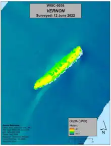 A wreck, possibly that of Vernon was found in 1908 by two fishermen, 8 miles (12.9 km) north of Two Rivers, Wisconsin, 5 miles (8.0 km) off shore in 300 feet (91.4 m) of water.[26] The wreck of Vernon was located in 1969 by Kent Bellrichard of Milwaukee, Wisconsin.[27] She rests intact in 210 feet (64 m) of water, northeast of Two Rivers. She is keeled over to starboard side. Her pilot house and cabins which broke away when she sank, lie west of her wreck in 160 feet (48.8 m) of water.[2][4] Her cargo is still intact within her hold.[28] Her gangways are still open, confirming Axel Stone's claims of her crew not being able to close them due to her excessive load. Various artefacts, including her name board are on display at the Rogers Street Fishing Village in Two Rivers.[2][4][8][29]