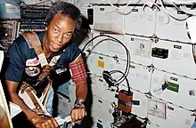 The commander, Truly, was the only veteran astronaut of the crew, having flown as the pilot on STS-2 in 1981 and for two of the Approach and Landing Tests (ALT) aboard Enterprise in 1977. Prior to this, he had worked as a capsule communicator (CAPCOM) for all three Skylab missions and the ASTP mission.[3] Brandenstein, Gardner and Bluford had all been recruited in 1978, and been training for a mission since 1979.[4] The mission had originally been planned for a crew of four, with Thornton added to the crew as a third mission specialist in December 1982, eight months after the crew was originally named.[5] As with Truly, he was an Apollo-era recruit, having joined NASA in 1967.[6] His participation on the mission included a series of tests aimed at gathering information on the physiological changes linked with Space Adaptation Syndrome, more commonly known as "space sickness"; this had become a focus of attention in NASA, as astronauts succumbed to it during Shuttle missions.[5]