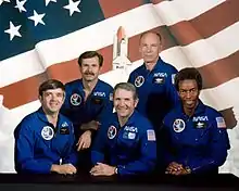 This mission had a crew of five, with three mission specialists. It was the second mission (after STS-7) to fly with a crew of five, the largest carried by a single spacecraft up to that date.[1] The crew was historically notable for the participation of Guion Bluford, who became the first African-American to fly in space.[2]