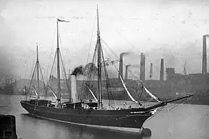 SY Hiawatha was built as the steam yacht Nora by Charles Mitchell & Co, Low Walker, Newcastle Upon Tyne. She was launched on 21 December 1879 (Yard Number 392),[3] but was renamed as the SY Hiawatha in 1888 when she was taken into the ownership of Donald Horne Macfarlane and re-registered in Southampton. Her dimensions were 339grt, 219nrt, 176.8 x 26.1 x 13.4 ft and she was powered by a single screw propeller and a steam engine constructed by R & W Hawthorn, Newcastle. Over her long lifetime she had many changes of ownership and name changes (and was variously known as the Clara, Polygon, La Valette, Akbas and Yeni Gundogdu), but between 1913 and 1915 she had reverted to the name Hiawatha and was owned by Noel Pemberton Billing and registered in London.[3] In 1916 she was converted to a salvage vessel and between November 1917 to 1919 she was employed on Admiralty service as the La Valette. She was eventually (in 1966) converted into a cargo vessel and ended her life as B. Kartal in Turkey, where she was finally broken up in 1982.[3]