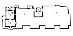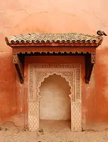 The southernmost chamber was intended to be a small mosque or prayer room, which is why it features a mihrab on its south/southeast wall. In Islamic architecture the mihrab is a niche or alcove symbolizing the qibla (the direction of prayer). The mihrab here resembles that of the Ben Youssef Madrasa (also Saadian in origin): a horseshoe arch surrounded by elaborate stucco decoration and hiding a small muqarnas cupola inside. The decoration of the lower parts of the mihrab, however, appears to have been left unfinished: the outlines of a pattern have been traced but they have not been filled-in and carved.[4][7] This is believed to be due to Ahmad al-Mansur dying before the decoration was completely finished and his successors lacking the will or the resources to finish it.[7] A total of 8 engaged columns, made out of veined marble, are arranged around the base of the mihrab.[4] The rest of the chamber is a large rectangular space marked by four columns supporting arches. The columns and the arches split the upper space of the chamber into 9 rectangular areas, with each division having its own wooden ceiling with star patterns.[4] The ceiling in front of the mihrab, however, is different and instead features a large pyramid-shaped vault of intricate muqarnas (similar in style to the ceiling of the Chamber of Lalla Mas'uda). Since the vault has a square outline, it transitions into the rectangular space with two more sloped surfaces of muqarnas on either side.[4]