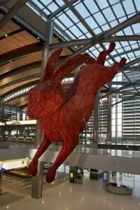 The Terminal B lobby prominently features the 2011 artwork "Leap" by Lawrence Argent, consisting of a 56-foot (17 m) long red aluminum rabbit leaping into a large granite suitcase,[50] resulting in the unofficial nickname "the Hare-port."[51] In total, 14 artists were commissioned at a sum cost of $6 million to create artworks for the new Terminal B,[52] including the mixed media wood-and-crystal sculpture "Acorn Steam" by Donald Lipski (named as an anagram of "Sacramento"), the interactive "Your Words are Music to My Ears" by the collaboration Living Lenses, consisting of artists Po Shu Wang and Louise Bertelsen,[51] a large wooden sculpture portrait entitled "The Baggage Handlers" by Christian Moeller, and a painted steel-and-glass house entitled "The House Will Not Pass for Any Color but Its Own" by Mildred Howard.[53][54][55]